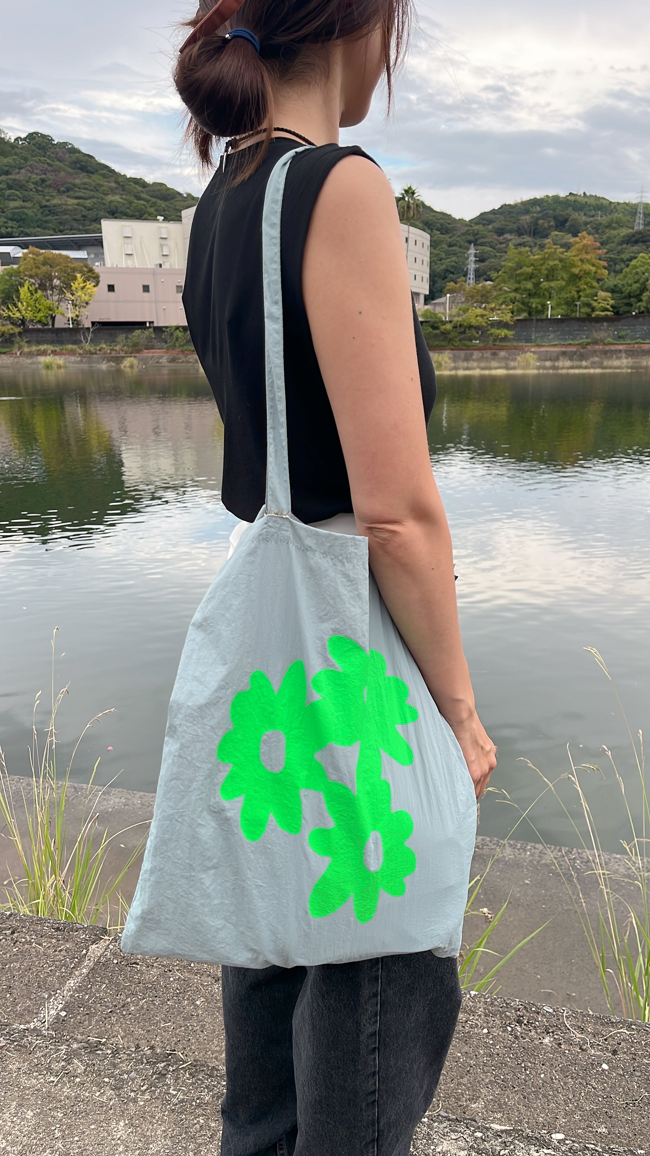 Flowers nylon tote bag・ice gray